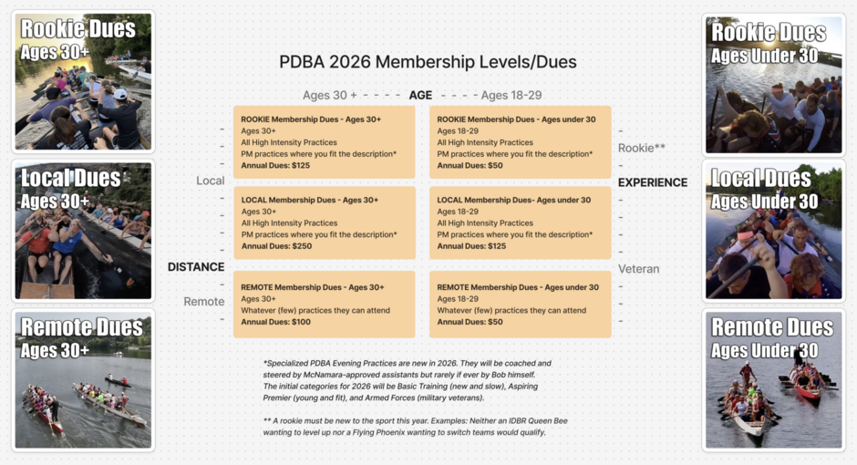 Here is a comparison chart of the six variations on PDBA membership. We've simplified the plans this year but still have the same low, low prices owing to the fundraising we do by hosting and volunteering to staff our own Independence Dragon Boat Regatta.